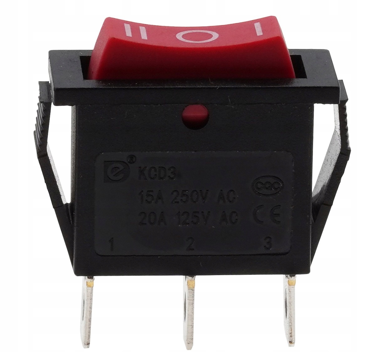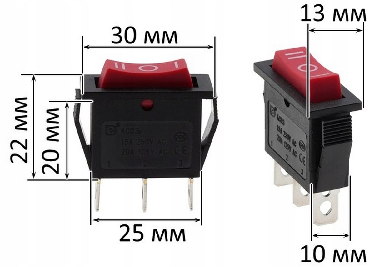 Przełącznik (tumbler) 3-pozycyjny z trzema stykami, stosowany np. w urządzeniach takich jak suszarka Zenit ZF-2010 M. Klawisz ma szerokość 13 mm i długość 30 mm. Podstawa urządzenia posiada wymiary: szerokość 10 mm, długość 25 mm i wysokość 20 mm. Całkowita wysokość wynosi 22 mm. Przełącznik działa przy maksymalnym obciążeniu 15 A i napięciu do 250 V. Posiada mechanizm blokujący 2 pozycje (fixacja w dwóch krajach), co zapewnia stabilność ustawienia w tych pozycjach.