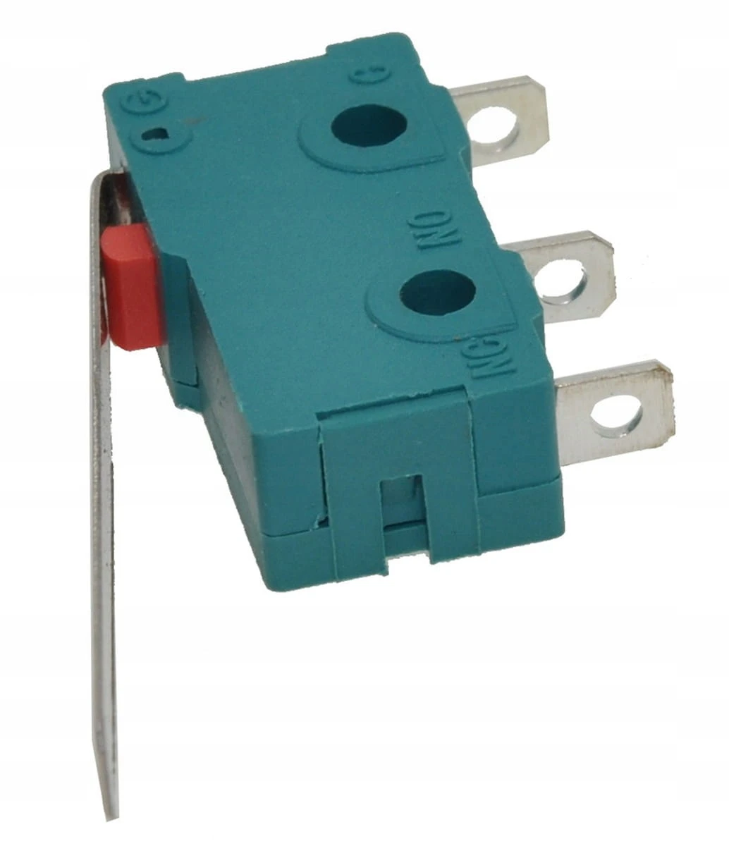 Wyłącznik (mikrowyłącznik) Daier KW4-3 o wymiarach 20×10×6 mm. Przystosowany do pracy przy natężeniu 5 A i napięciu 250 VAC. Doskonały jako część zamienna w elektronarzędziach i układach sterujących, gdzie potrzebne są niewielkie elementy.
