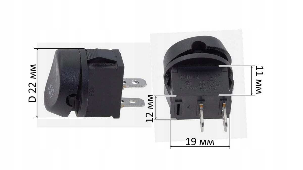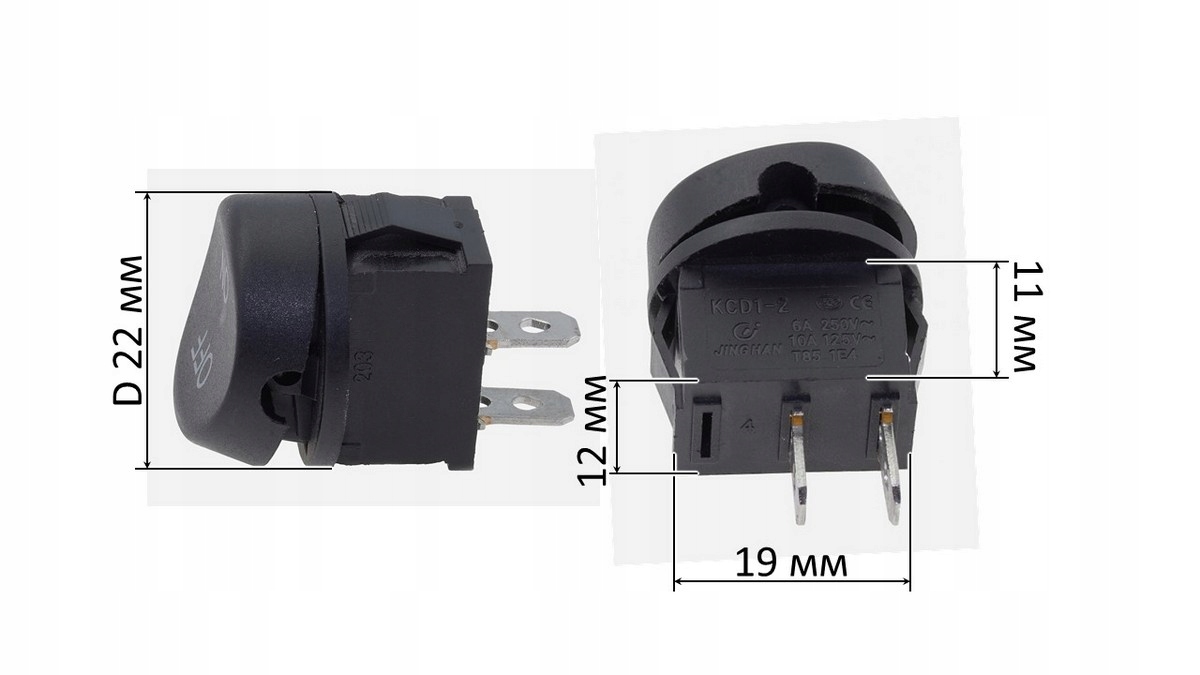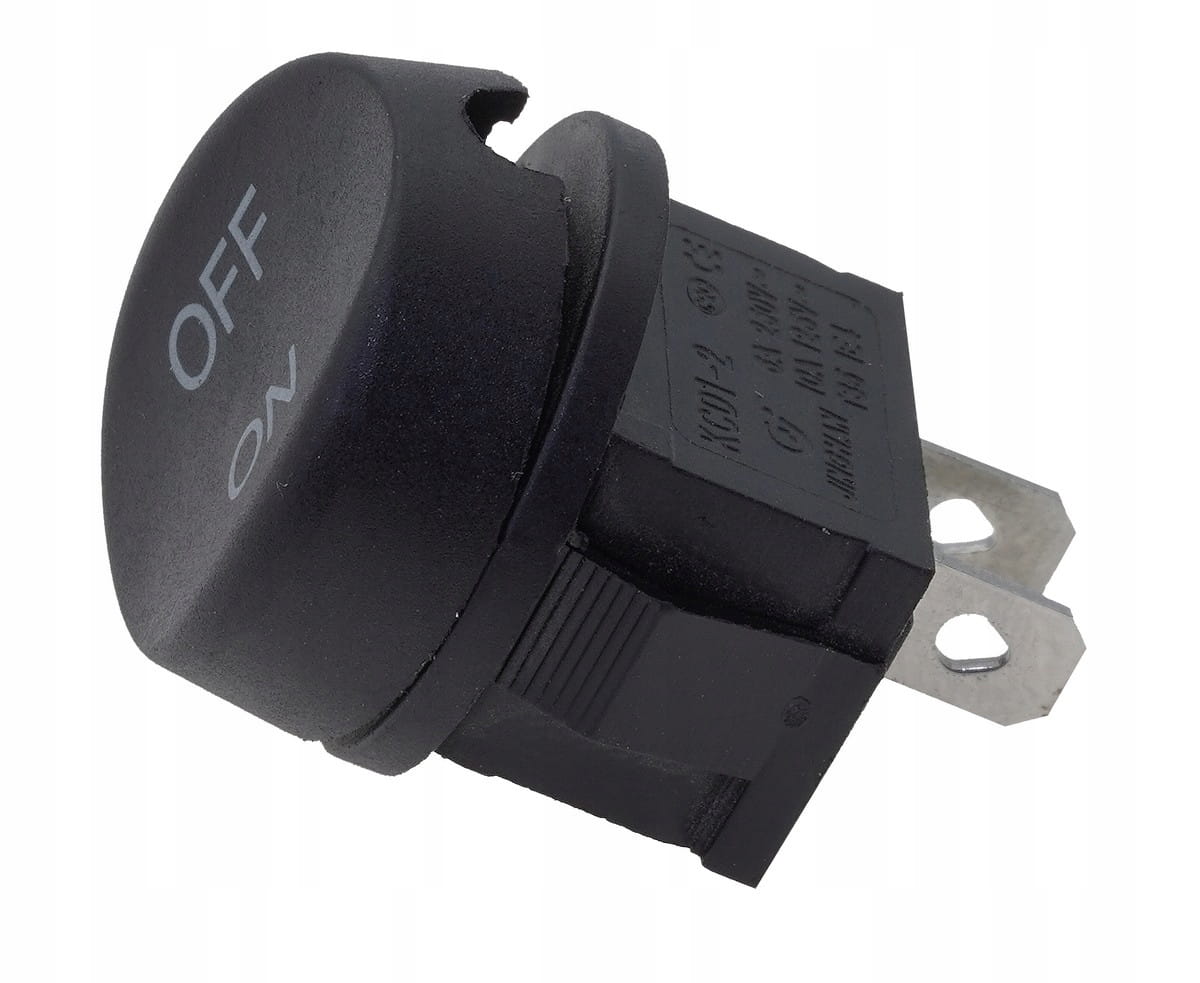 Przełącznik (tumbler) okrągły dwupozycyjny z dwoma stykami. Średnica klawisza wynosi 22 mm. Grupa styków ma szerokość 12 mm, długość 19 mm i głębokość 11 mm. Przełącznik działa przy maksymalnym prądzie 6 A. Idealny do zastosowań, gdzie potrzebne jest estetyczne rozwiązanie sterowania dwupozycyjnego z kompaktowymi wymiarami.