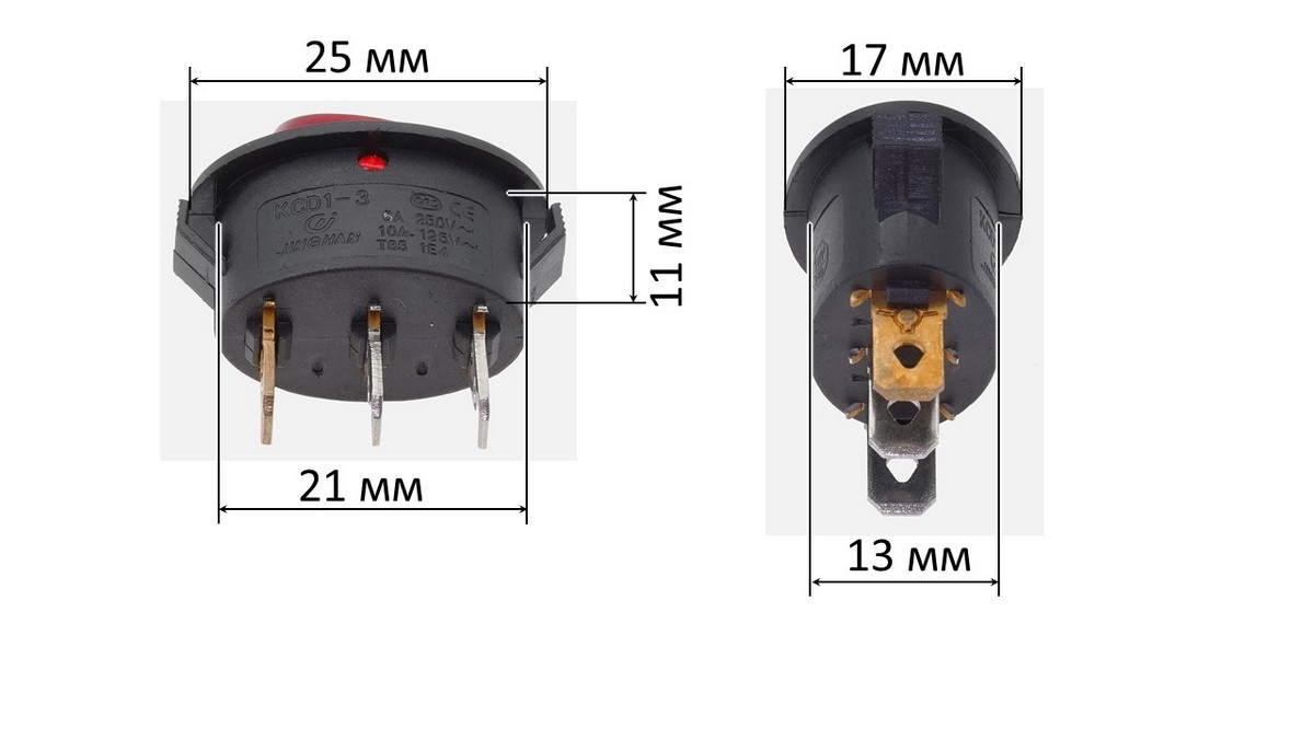 Przełącznik (tumbler) owalny 2-pozycyjny z trzema stykami i wbudowaną diodą LED. Klawisz ma szerokość 17 mm i długość 25 mm, co nadaje mu kompaktowy i ergonomiczny kształt.