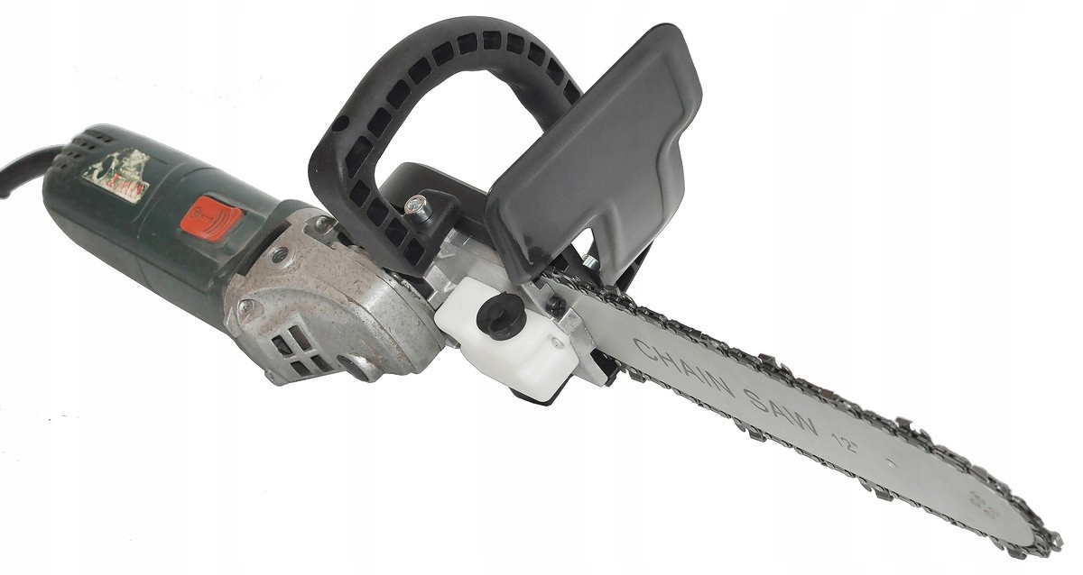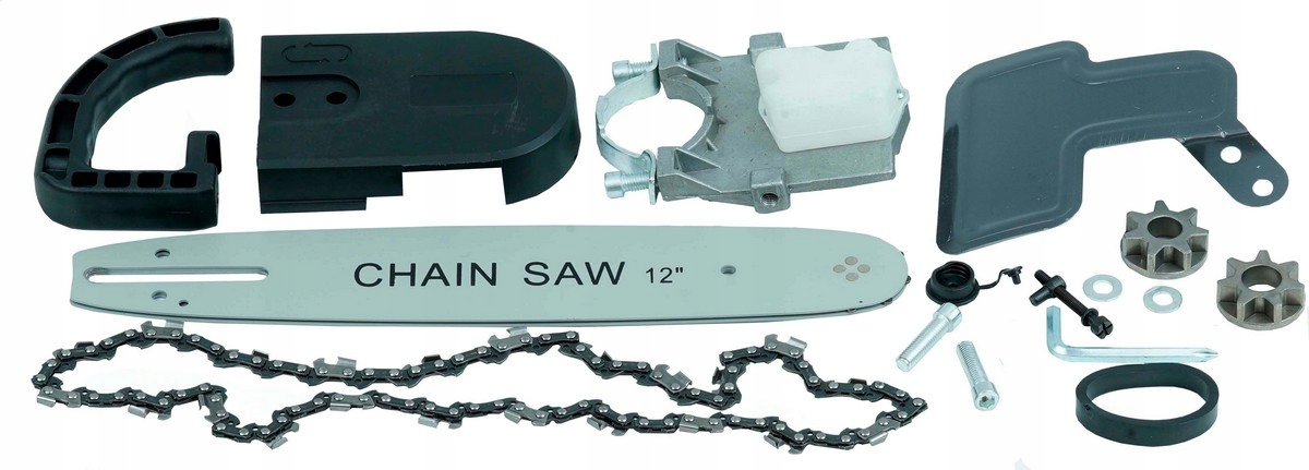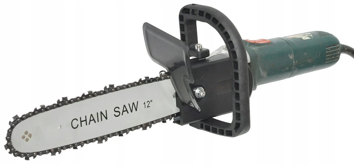 Adaptor do szlifierki kątowej zamieniający ją w mini-piłę łańcuchową wyposażoną w prowadnicę o długości ok. 30 cm (12″), zbiornik oleju 70 ml oraz system smarowania łańcucha. Uniwersalny montaż pasuje do urządzeń z flanszą do 49 mm, a metalowa osłona zapewnia dodatkowe zabezpieczenie.