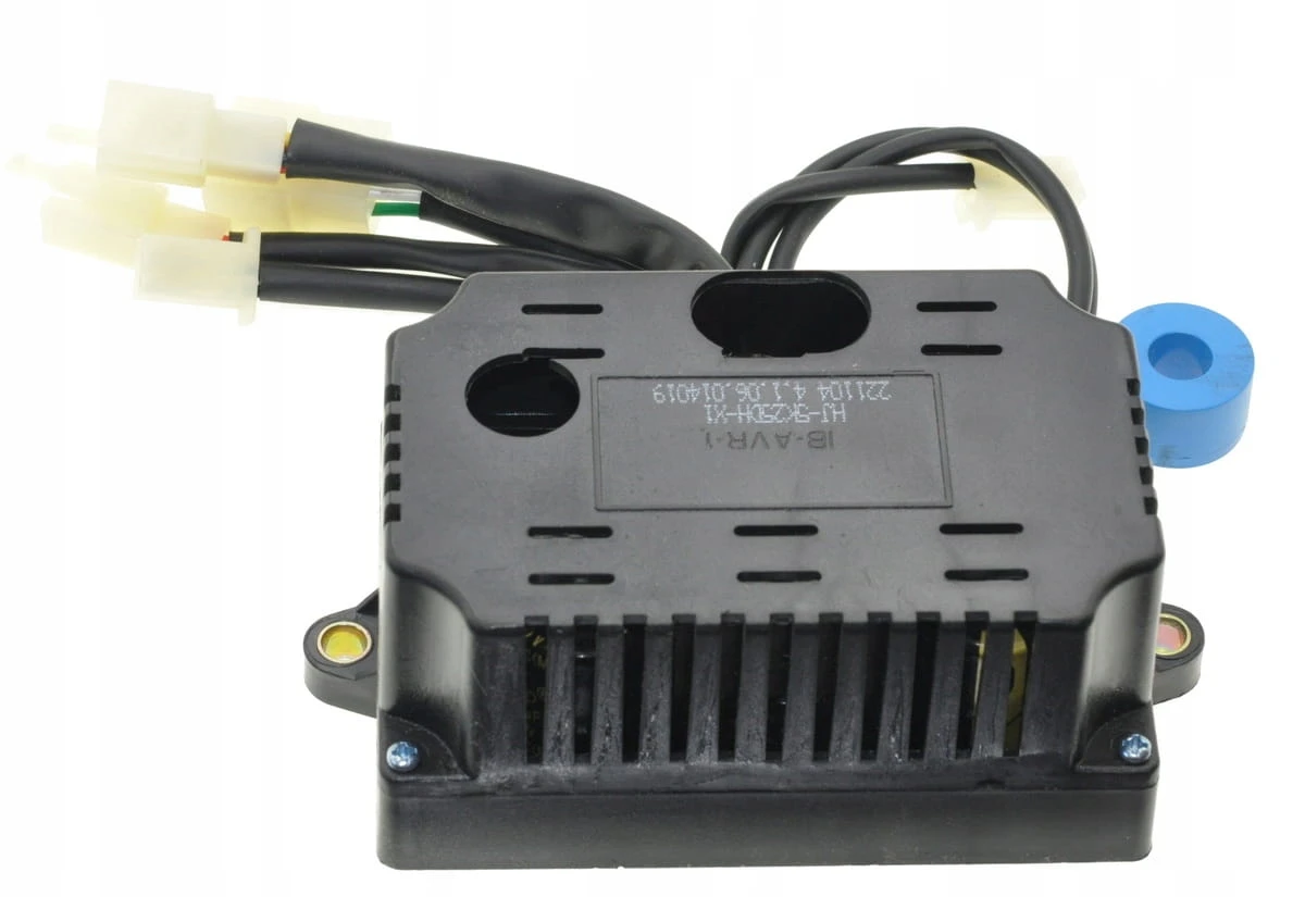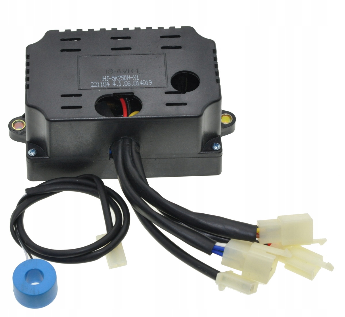 Cyfrowy automatyczny regulator napięcia (AVR), model HJ-5K25DH-X1, przeznaczony do jednofazowych generatorów o mocy 5 kW. Zapewnia stabilizację napięcia wyjściowego, chroniąc urządzenia przed jego wahaniami i zapewniając płynną pracę agregatów, również w zastosowaniach spawalniczych. Standardowy rozstaw montażowy 128 mm oraz połączenie via cztery wtyczki i dwanaście przewodów umożliwiają łatwą instalację i serwis.