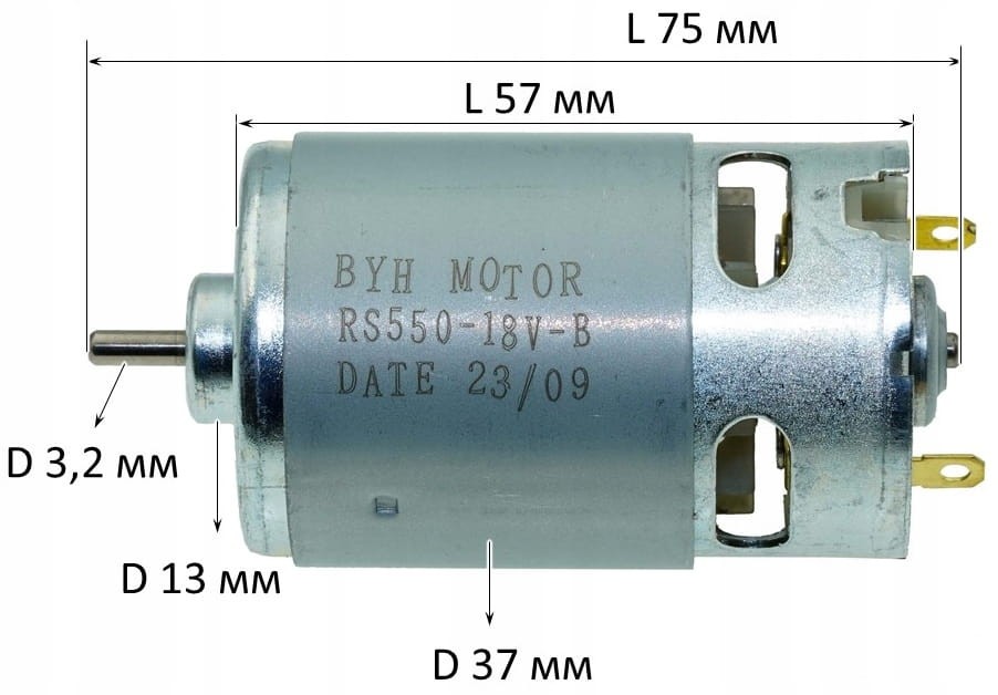 Uniwersalny silnik prądu stałego do wkrętarek akumulatorowych 18 V — kompatybilny z większością modeli chińskich i krajowych. Kompaktowa obudowa o średnicy 37 mm i długości korpusu 57 mm (całkowita długość z wałkiem: 75 mm) umożliwia zastosowanie w wielu konstrukcjach narzędzi. Wałek o średnicy 3,2 mm zapewnia pewne przeniesienie momentu obrotowego. Solidna i precyzyjna konstrukcja gwarantuje niezawodność i długą żywotność, również przy intensywnej pracy.