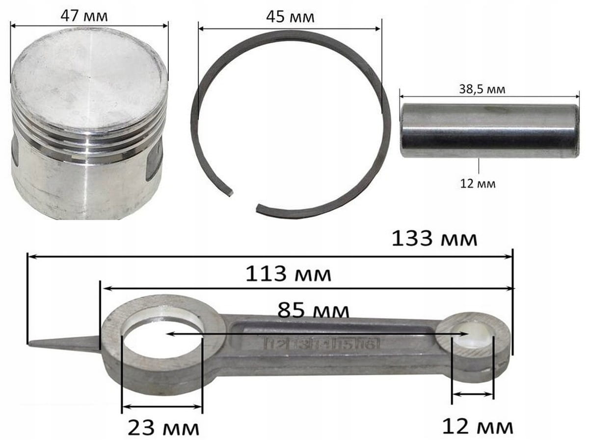 - Średnica palca tłokowego: ok. 12 mm (zewnętrzna), 8 mm (wewnętrzna)