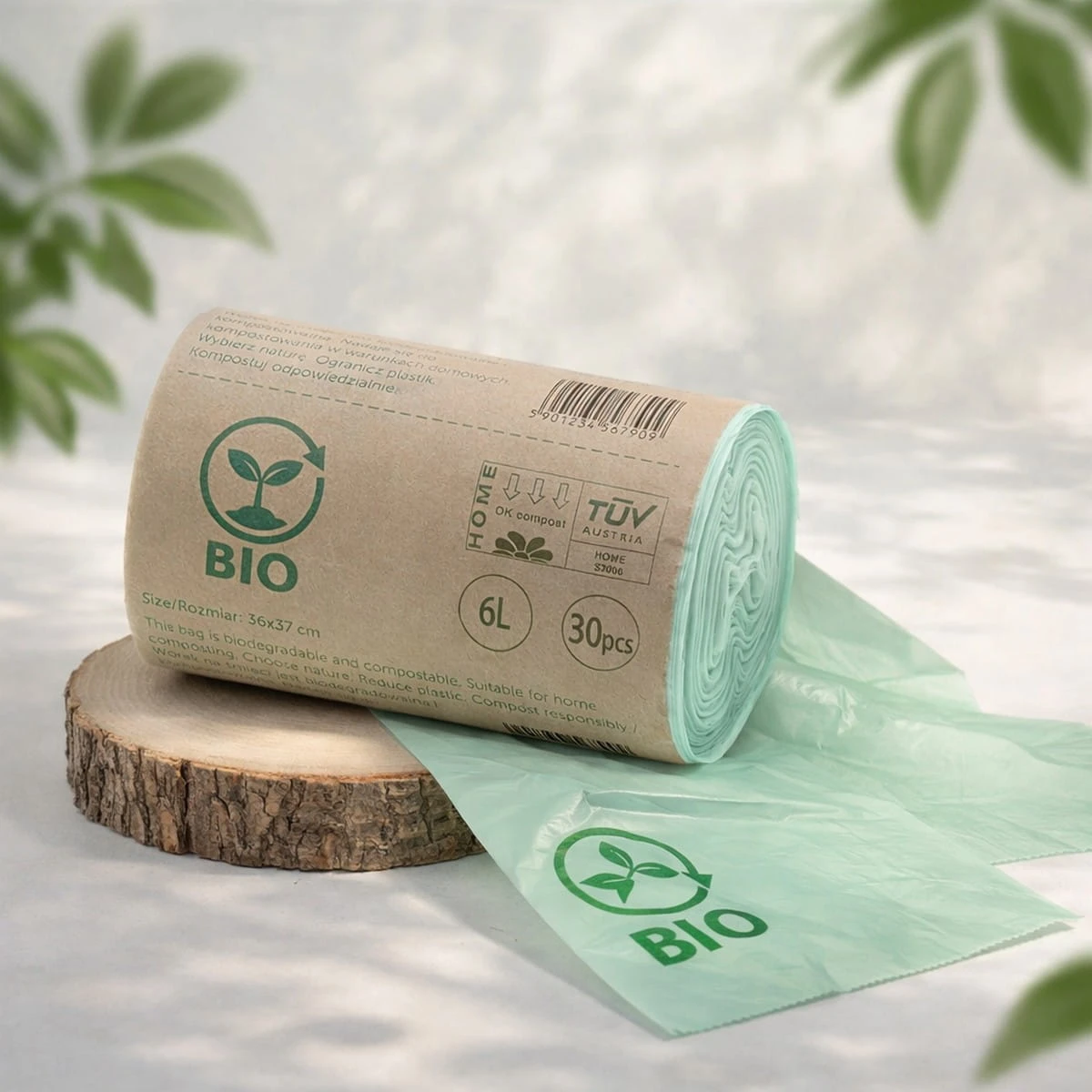Torby wykonane z materiału biodegradowalnego, który ulega rozkładowi w środowisku naturalnym. To doskonała alternatywa dla tradycyjnych worków foliowych.