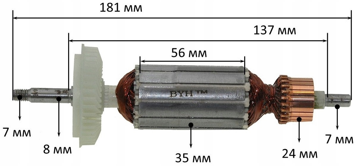 Wirnik (rotor) przeznaczony do szlifierki kątowej Bosch GWS 14-125 (CI), jak również modeli GWS 1400. Wałek ma średnicę 8 mm. Całkowita długość wirnika to 181 mm, długość pakietu 56 mm. Obudowa zapewnia dokładne dopasowanie do łożysk: górne 8 mm, dolne 7 mm, odległość między łożyskami 137 mm. Średnica komutatora to 24 mm, a średnica pakietu 35 mm.