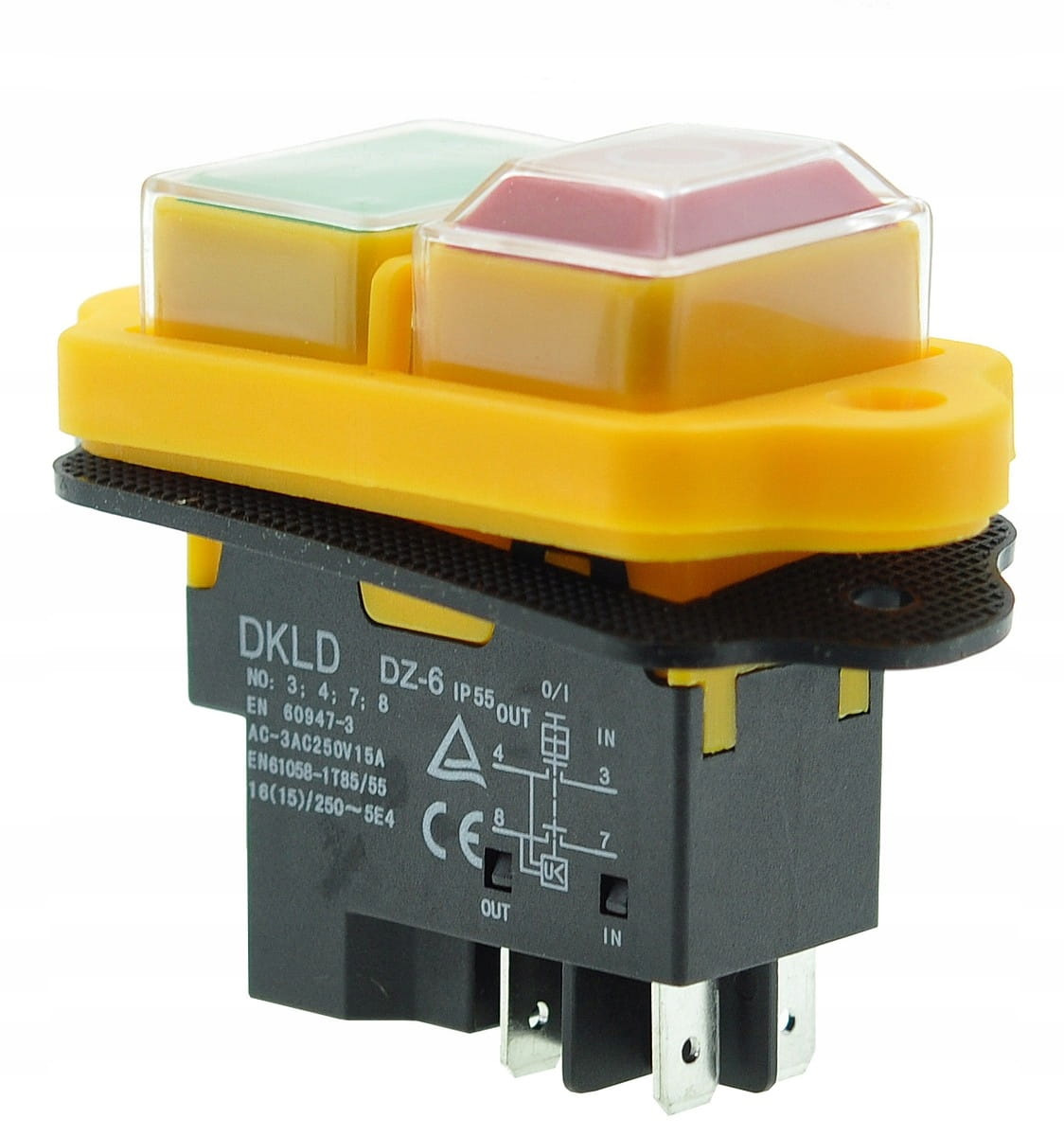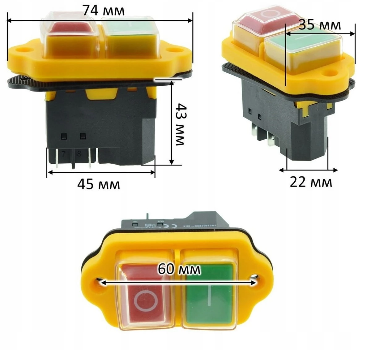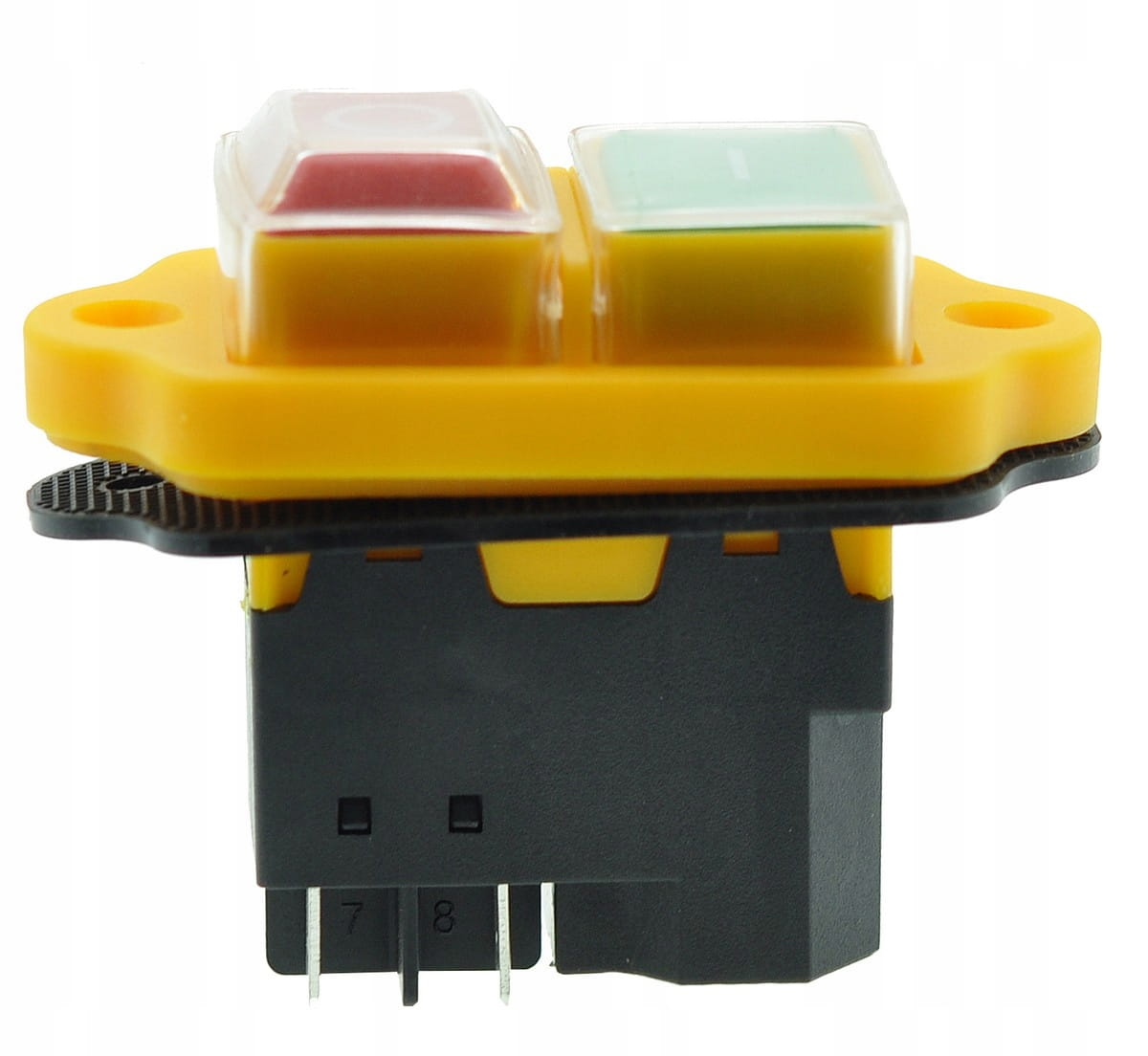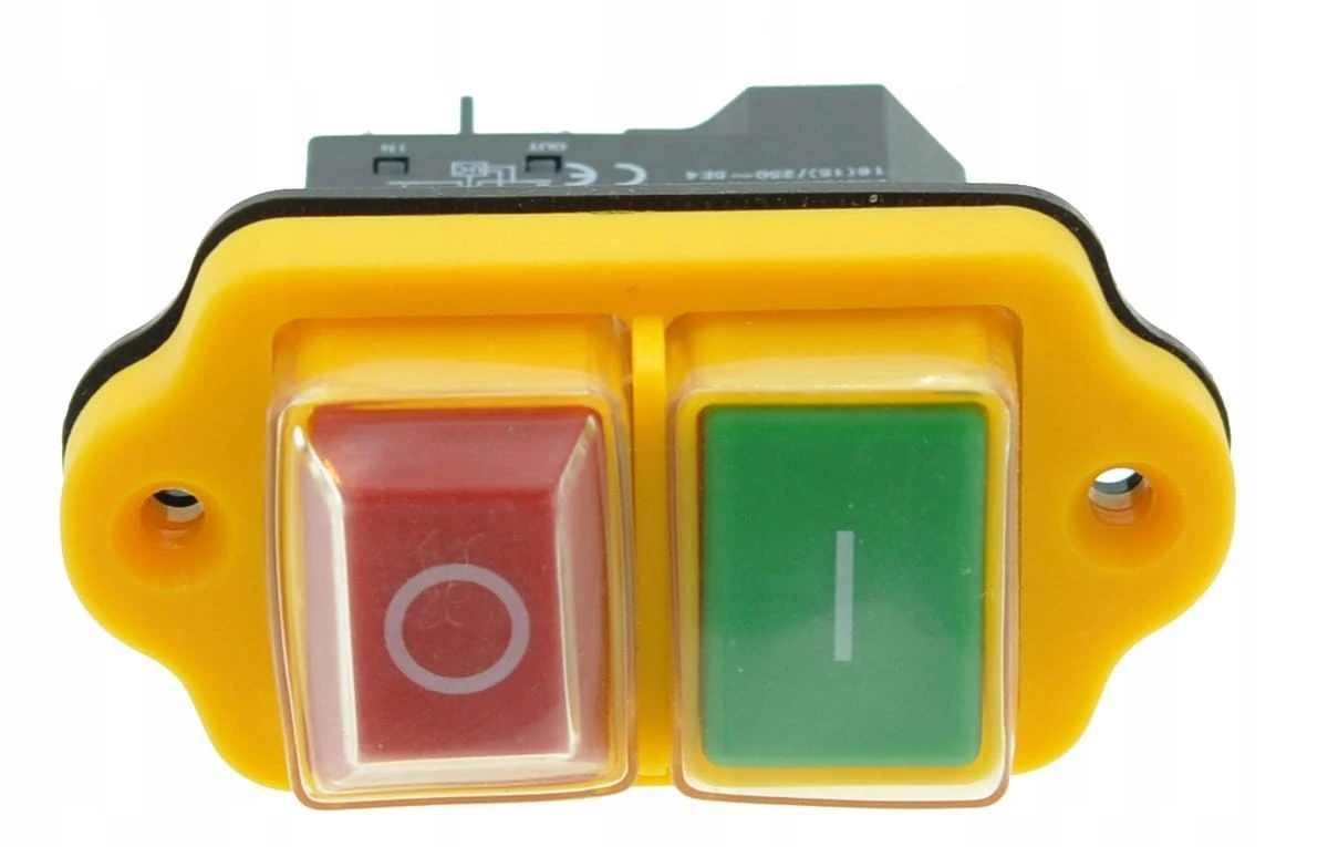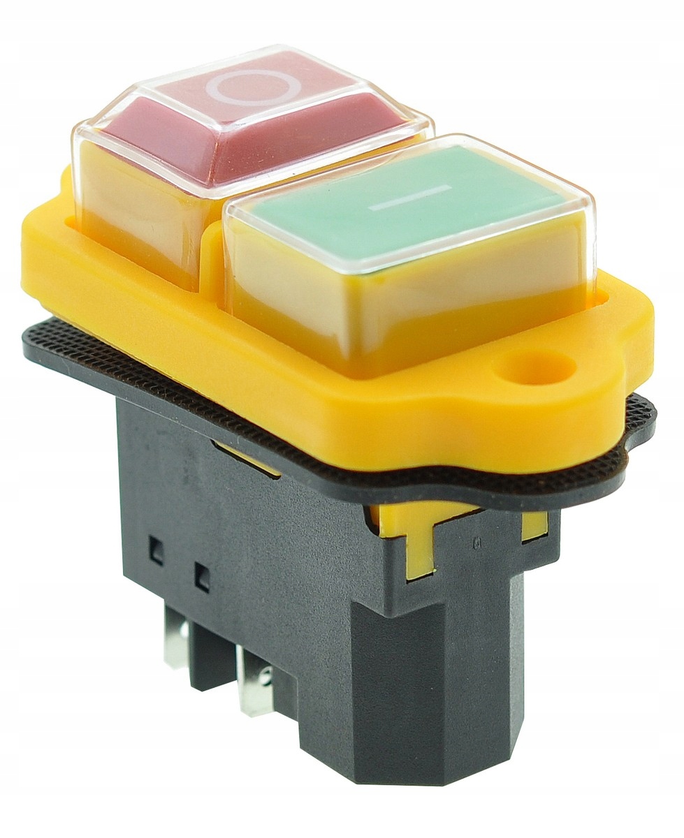 Wyłącznik do betoniarki z 4 stykami, w żółtej obudowie, o wymiarach podstawy 43×26×39 mm. Przeznaczony do uruchamiania i zatrzymywania urządzeń. Solidna konstrukcja oraz jasny kolor zapewniają niezawodność i łatwą identyfikację przycisku w każdych warunkach.
