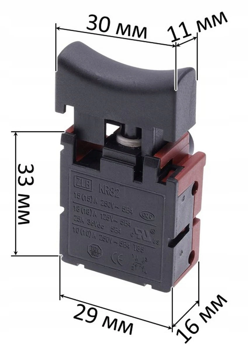 Wyłącznik przeznaczony do podkaszarki Tekhmann BCE-2013. Posiada klawisz o wymiarach 30×11 mm i podstawę 16×33 mm. Obsługuje prąd znamionowy 10 A i jest wyposażony w blokadę, co zapewnia wygodę oraz bezpieczeństwo podczas pracy.