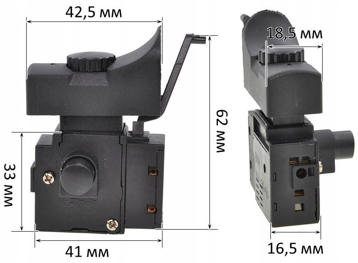 Wyłącznik do wiertarki 41×16,5×33 mm, klawisz 42,5×18,5 mm, 8 A, z blokadą