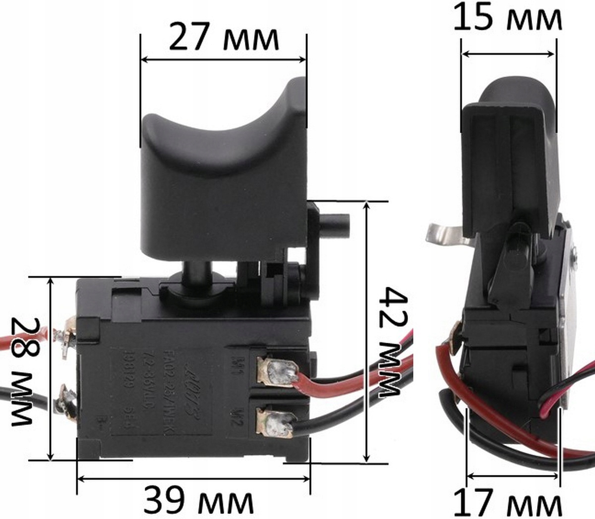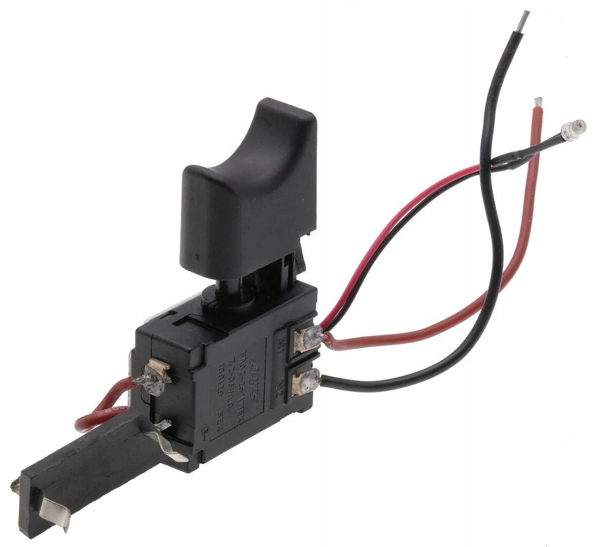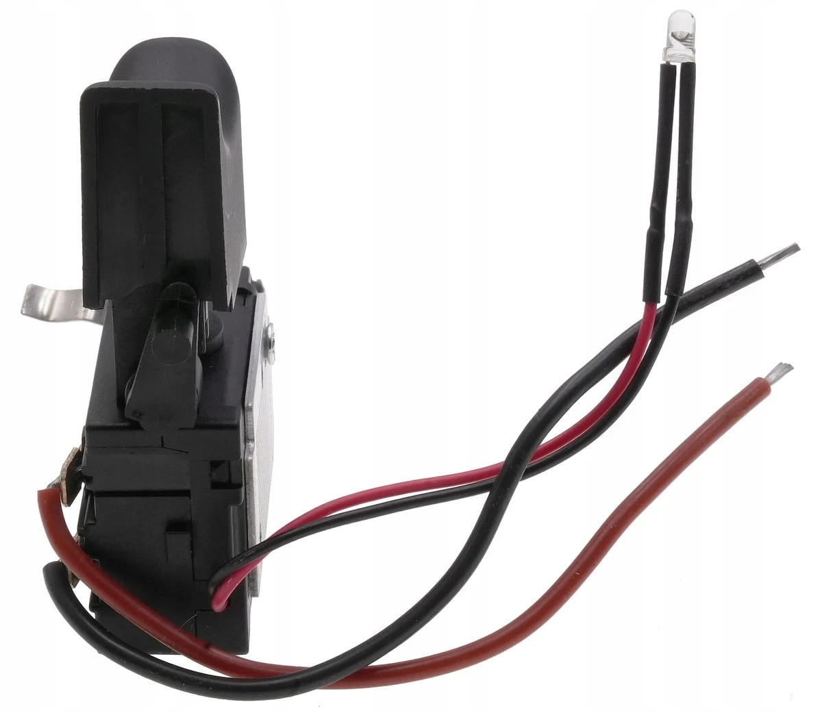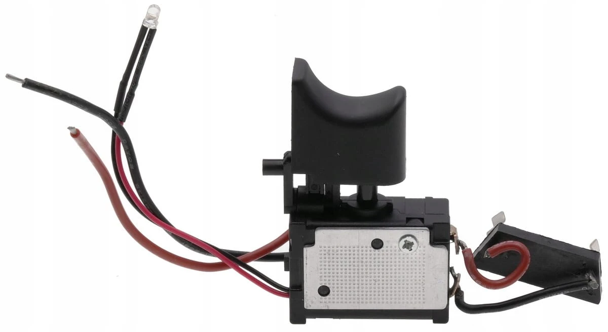 Wyłącznik zaprojektowany do wkrętarek z funkcją LED i rewersem. Klawisz o wymiarach 27×15 mm, podstawa 39×17×28 mm, rewers 42 mm, prąd 16 A. Model bez funkcji blokady (ON/OFF). Idealny jako część zamienna dla elektronarzędzi z podświetleniem.