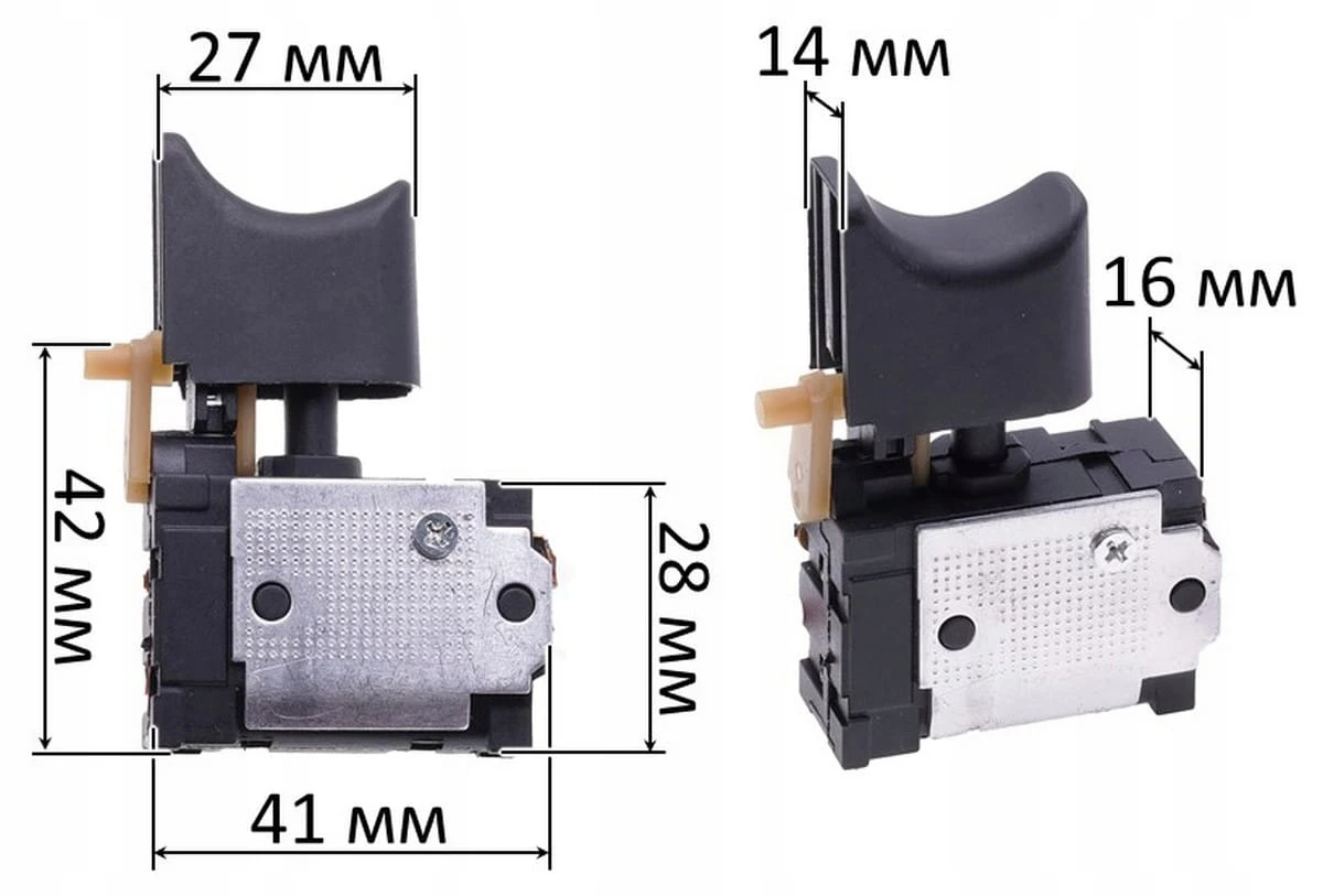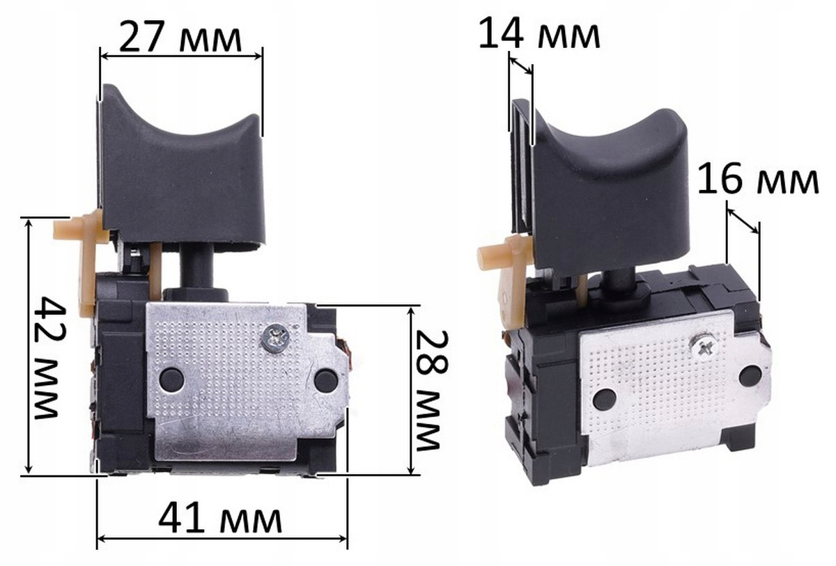 Wyłącznik przeznaczony do wkrętarek Haisser HS 2120-2B / HS 2120-Z. Posiada klawisz o wymiarach 27×14 mm, podstawę 41×16×28 mm oraz mechanizm rewers o wysokości 42 mm. Model bez blokady, działający przy natężeniu 16 A.