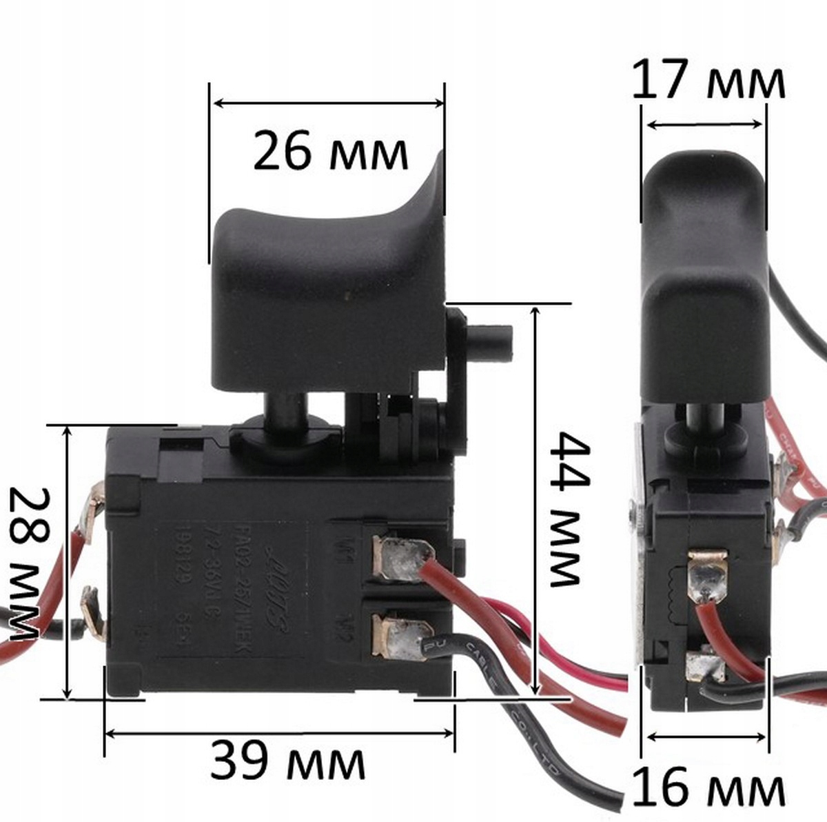 Wyłącznik do wkrętarki z kostką 39×16×28 mm, klawisz 26×17 mm, 16 A ✅