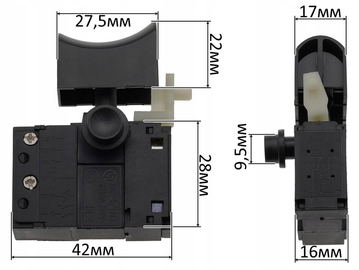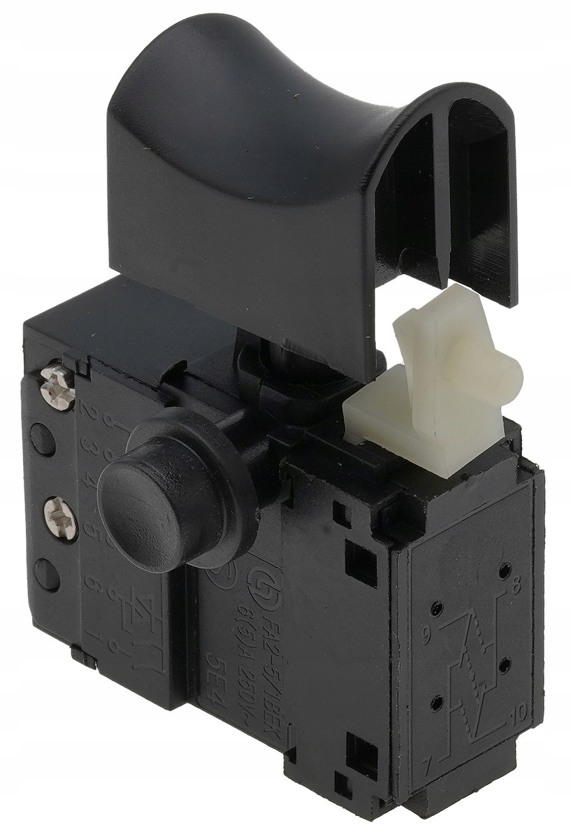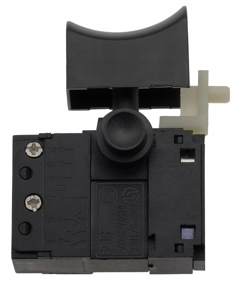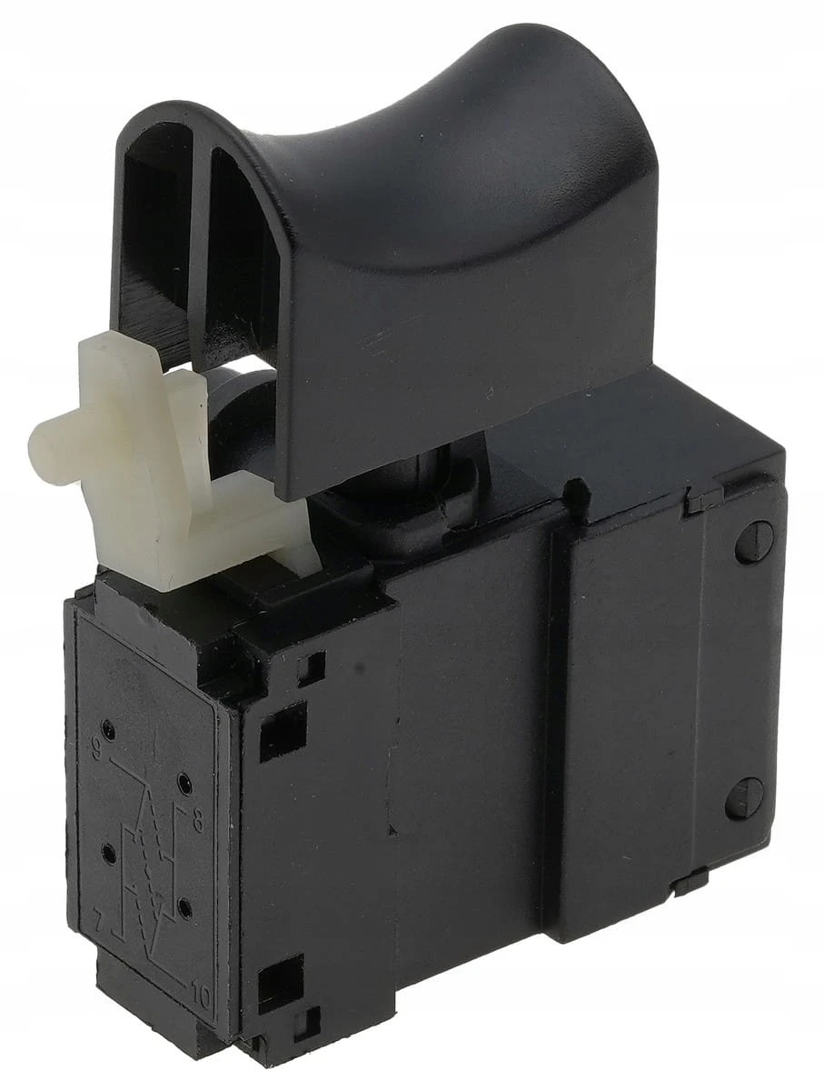 Wyłącznik przeznaczony do śrubokręta sieciowego. Wyposażony w klawisz o wymiarach 17×27,5 mm oraz podstawę 42×16×28 mm. Wysokość rewersa wynosi 43 mm. Obsługuje natężenie 6 A i posiada funkcję blokady, co zwiększa wygodę użytkowania. Idealny jako część zamienna, gdy oryginalny przycisk ulegnie zużyciu lub uszkodzeniu.