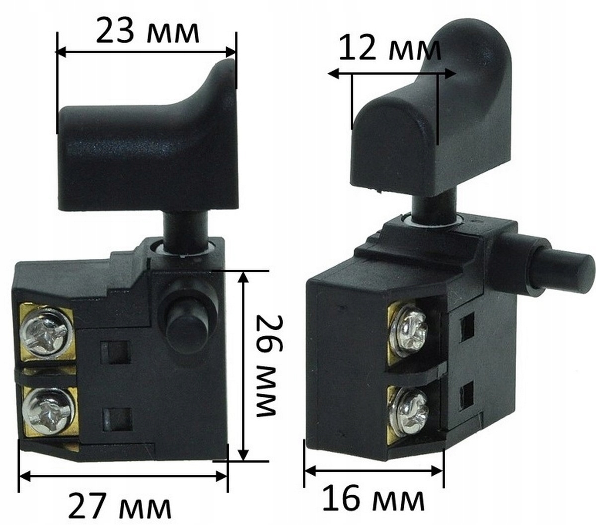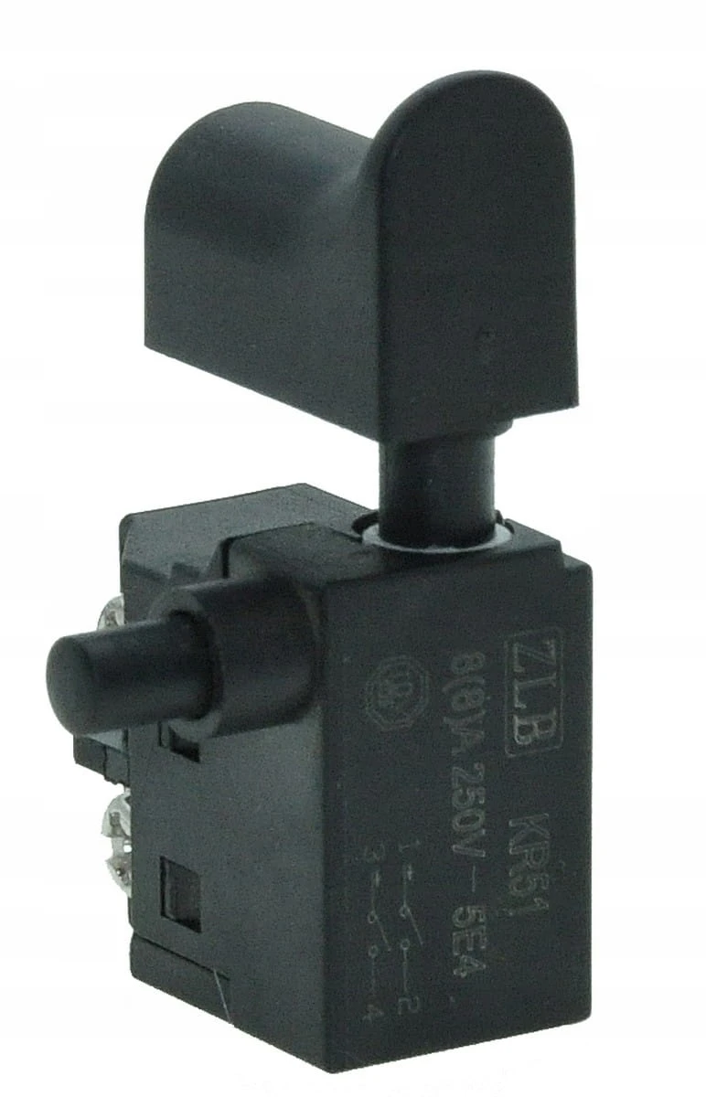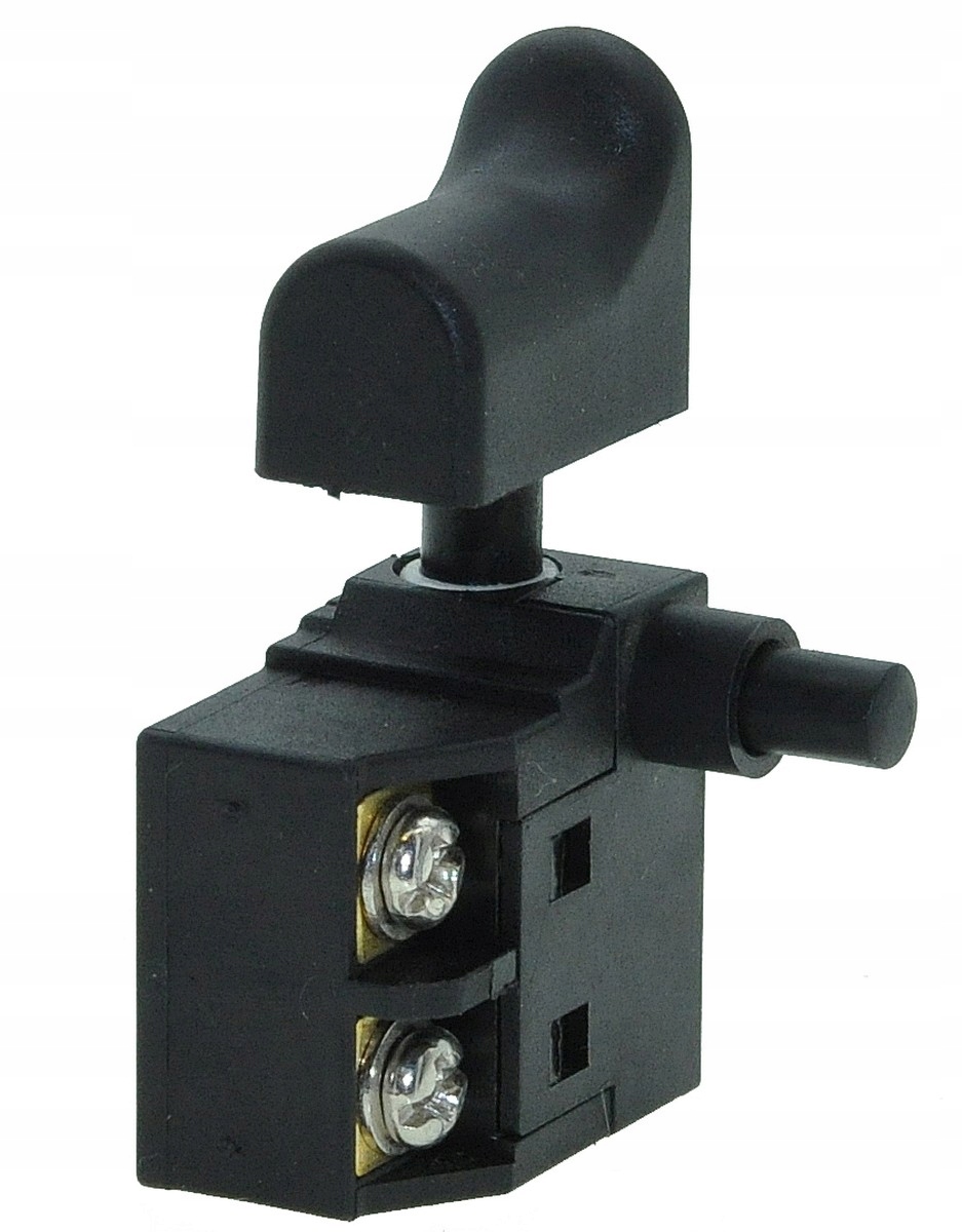 Wyłącznik do szlifierek kątowych. Posiada klawisz o wymiarach 23×12 mm oraz podstawę 27×16×26 mm. Działa przy natężeniu 6 A i wyposażony jest w funkcję blokady pozycji, co zwiększa komfort podczas pracy.