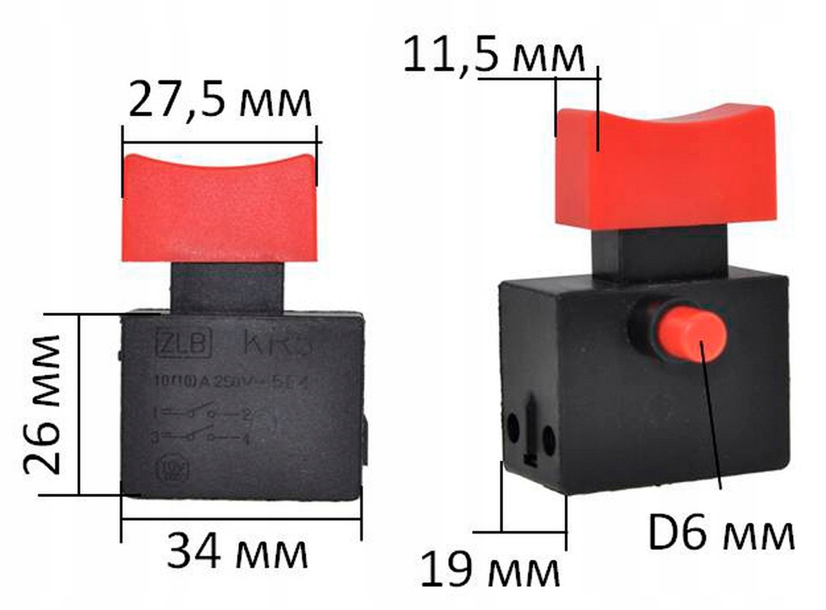 Wyłącznik do szlifierki kątowej Fiolent 230 (analog 5070162). Ma podstawę o wymiarach 34×19×26 mm oraz klawisz 76×12 mm. Obsługuje prąd 8 A. Model bez blokady pozycji — idealny jako część zamienna, gdy potrzebne jest proste włączanie/wyłączanie urządzenia.