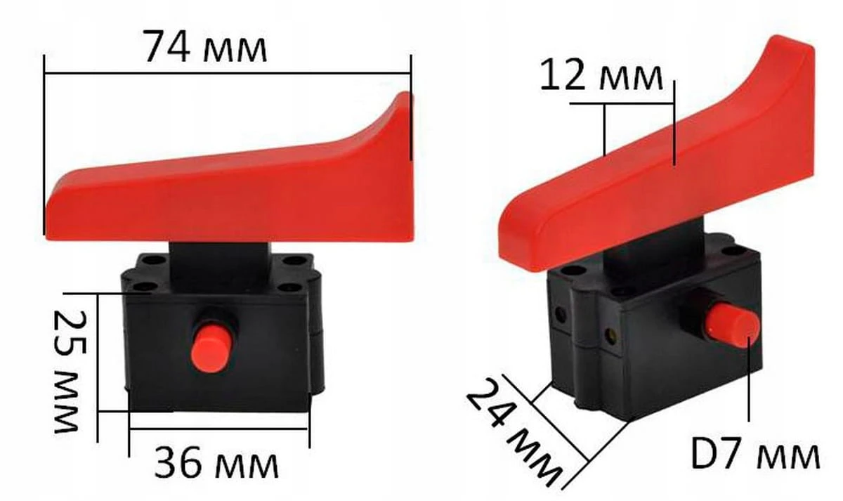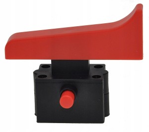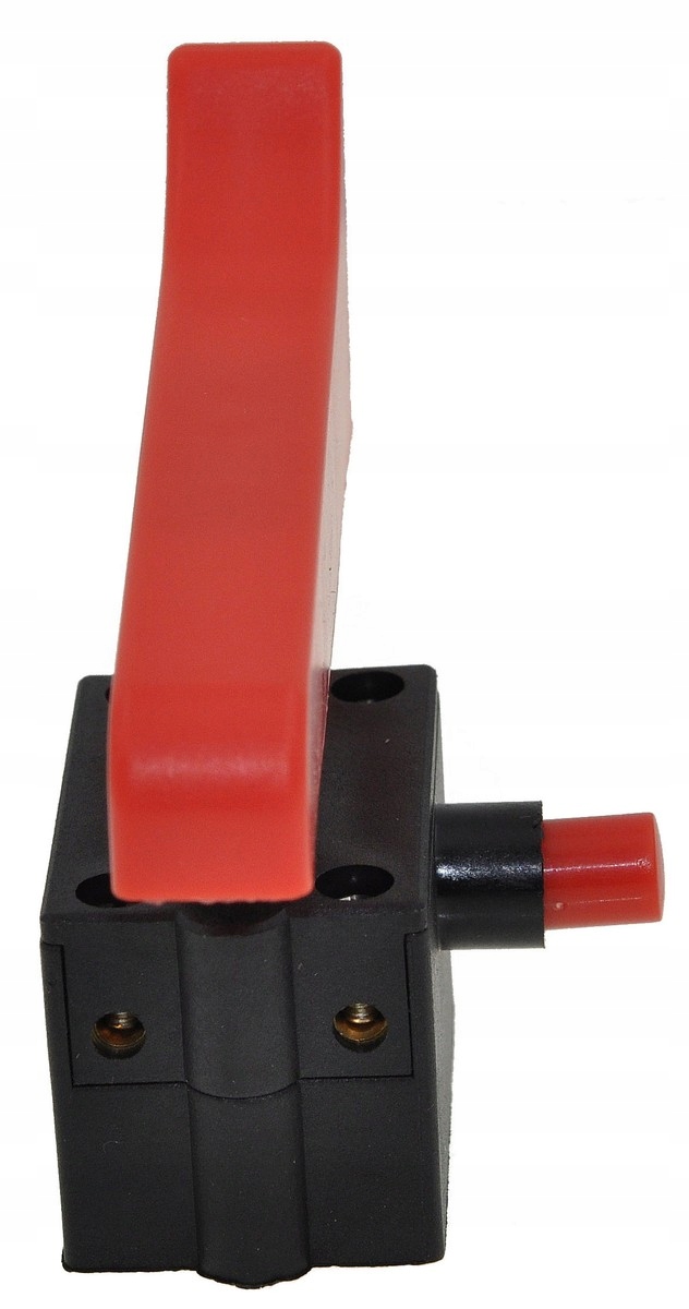Wyłącznik do szlifierek kątowych. Wyposażony w 4 styki oraz podstawę o wymiarach 36×24×25 mm. Klawisz o długości 74 mm i szerokości 12 mm. Obsługuje prąd do 12 A. Model z blokadą, idealny do pracy wymagającej ciągłego włączenia urządzenia.