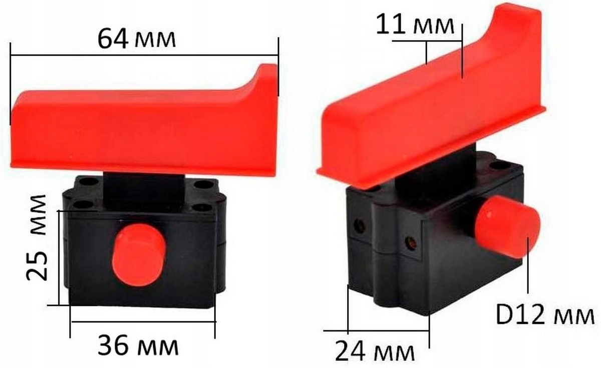 Wyłącznik szlifierki (4 styki) 36×24×25 mm, klawisz 64×11 mm, 12 A, z blokadą