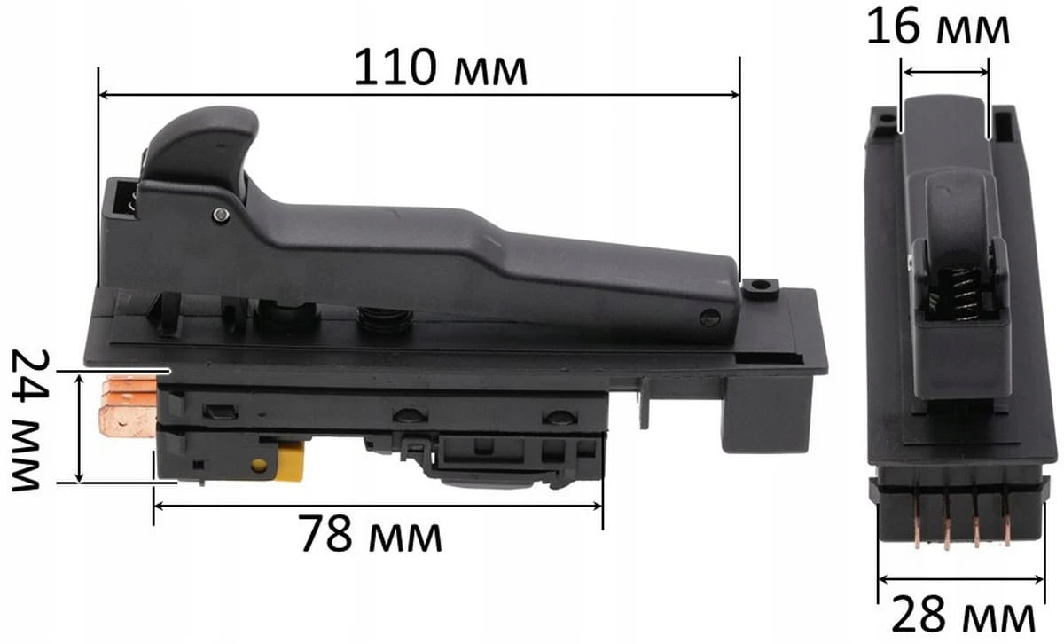 Wyłącznik szlifierki Fiolent 230 (4 styki) 78×28×24 mm, klawisz 110×16 mm, 12 A, z blokadą