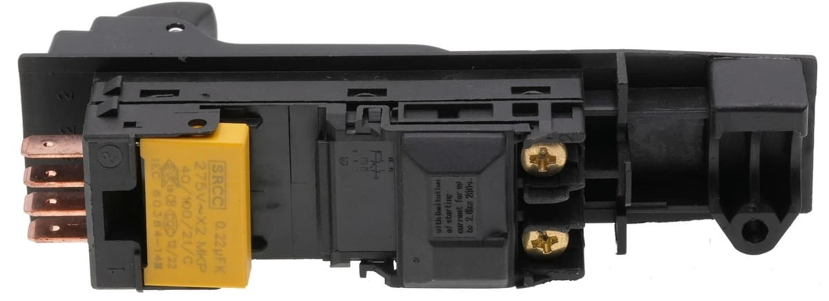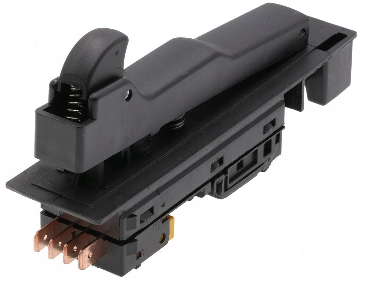 Wyłącznik do szlifierki kątowej Fiolent 230, analog 5091676 Wyposażony w 4 styki, klawisz o wymiarach 110×16 mm i podstawę 78×28×24 mm. Model obsługuje prąd 12 A i posiada blokadę pozycji, co ułatwia pracę przy długotrwałym użytkowaniu.
