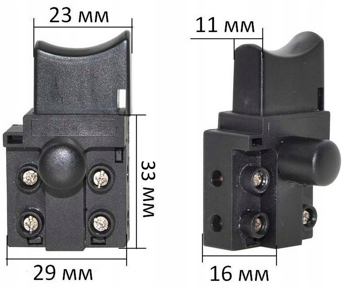 Wyłącznik do szlifierki kątowej ZUSCH-125/1250 oraz ZUSCH-125/1100 Profi, wyposażony w 4 styki i funkcję blokady. Kompaktowa podstawa (29×16×33 mm) i klawisz o wymiarach 23×11 mm zapewniają łatwy montaż i wygodne użytkowanie. Przystosowany do intensywnej pracy w warunkach warsztatowych i budowlanych.