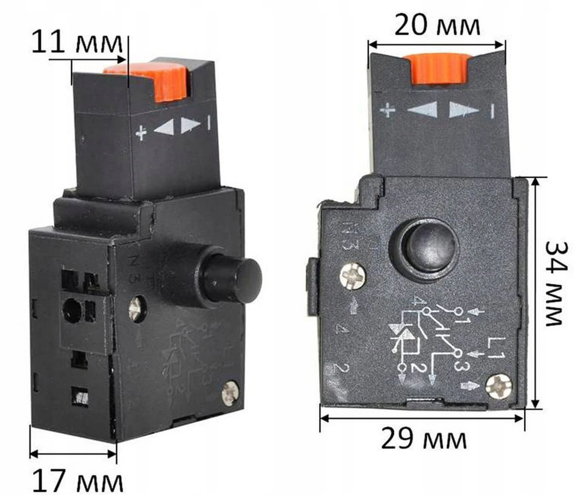 Wyłącznik przeznaczony do wiertarek, wykonany z trwałego tworzywa sztucznego. Posiada klawisz o wymiarach 20×11 mm oraz podstawę 29×17×34 mm. Przystosowany do prądu znamionowego 5 A, działa z funkcją blokady. Idealny jako część zamienna w elektronarzędziach, zapewnia niezawodność i wygodę użytkowania.