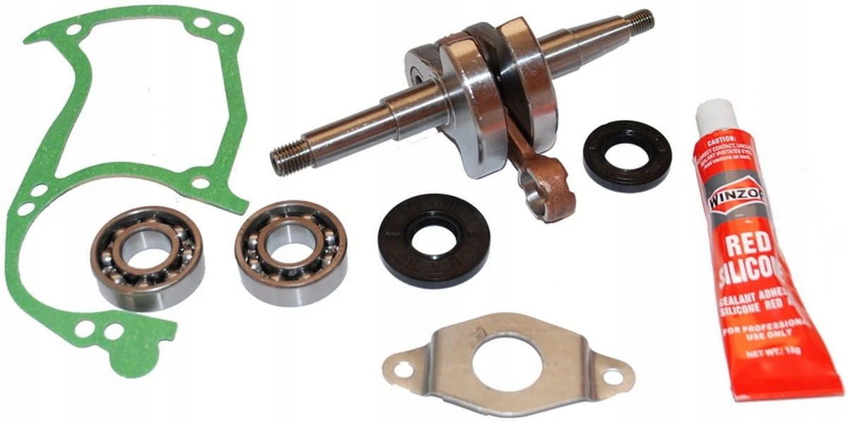 Kompletny zestaw z wałem korbowym przeznaczony do pilarek spalinowych serii 4500/5200. W skład kompletu wchodzą: wał korbowy, łożyska, uszczelniacze oraz hermetyk montażowy. Elementy zostały wykonane z wytrzymałych materiałów, co zapewnia długą żywotność i stabilną pracę silnika. Wał korbowy jest odpowiedzialny za przeniesienie energii z tłoka na mechanizm tnący, a jego precyzyjne wykonanie gwarantuje prawidłową eksploatację pilarki.